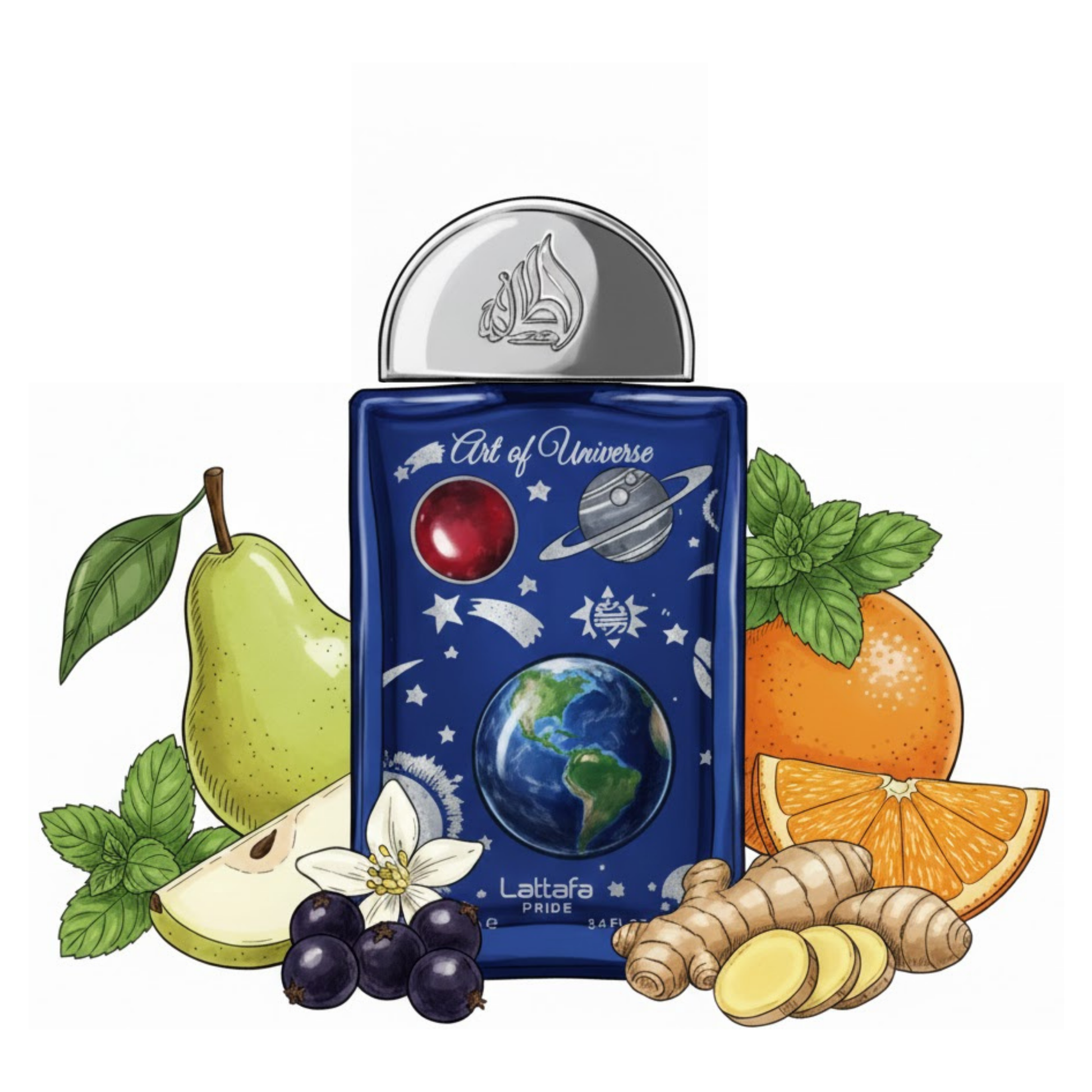 Lattafa Art of Universe is a bright, citrus‑fruity unisex fragrance that feels like stepping into fresh air with a splash of juice and spice. The scent opens with a lively burst of mandarin and bergamot lifted by cool mint and a spark of ginger. In the heart, juicy pear blends with soft orange blossom for a fruity‑floral heart that’s uplifting yet smooth. The base wraps everything in warm amber, sensual musk, and grounded cedarwood, keeping the trail refined and modern. It’s a versatile, energizing scent that works effortlessly from day to night.